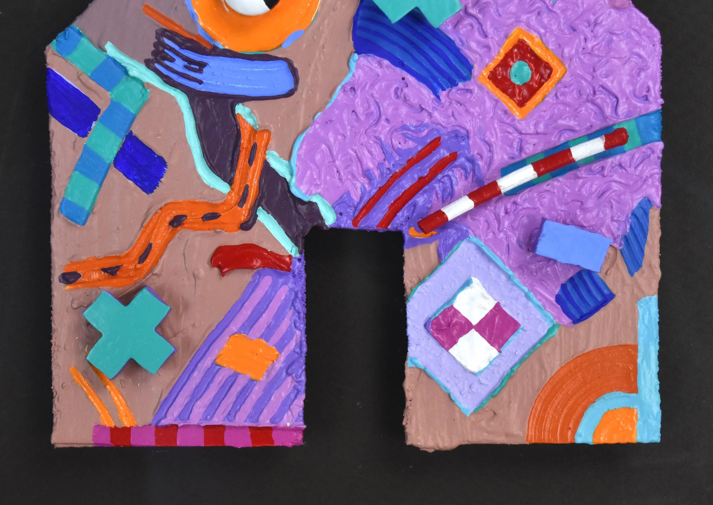 Unique mixed media sculpture, float framed in a black frame under glass with black back mat. Geometric house-shaped piece with paint and other mixed media elements to give it unique depth and dimension. Measures approximately 13in x 13in. Excellent vintage condition.