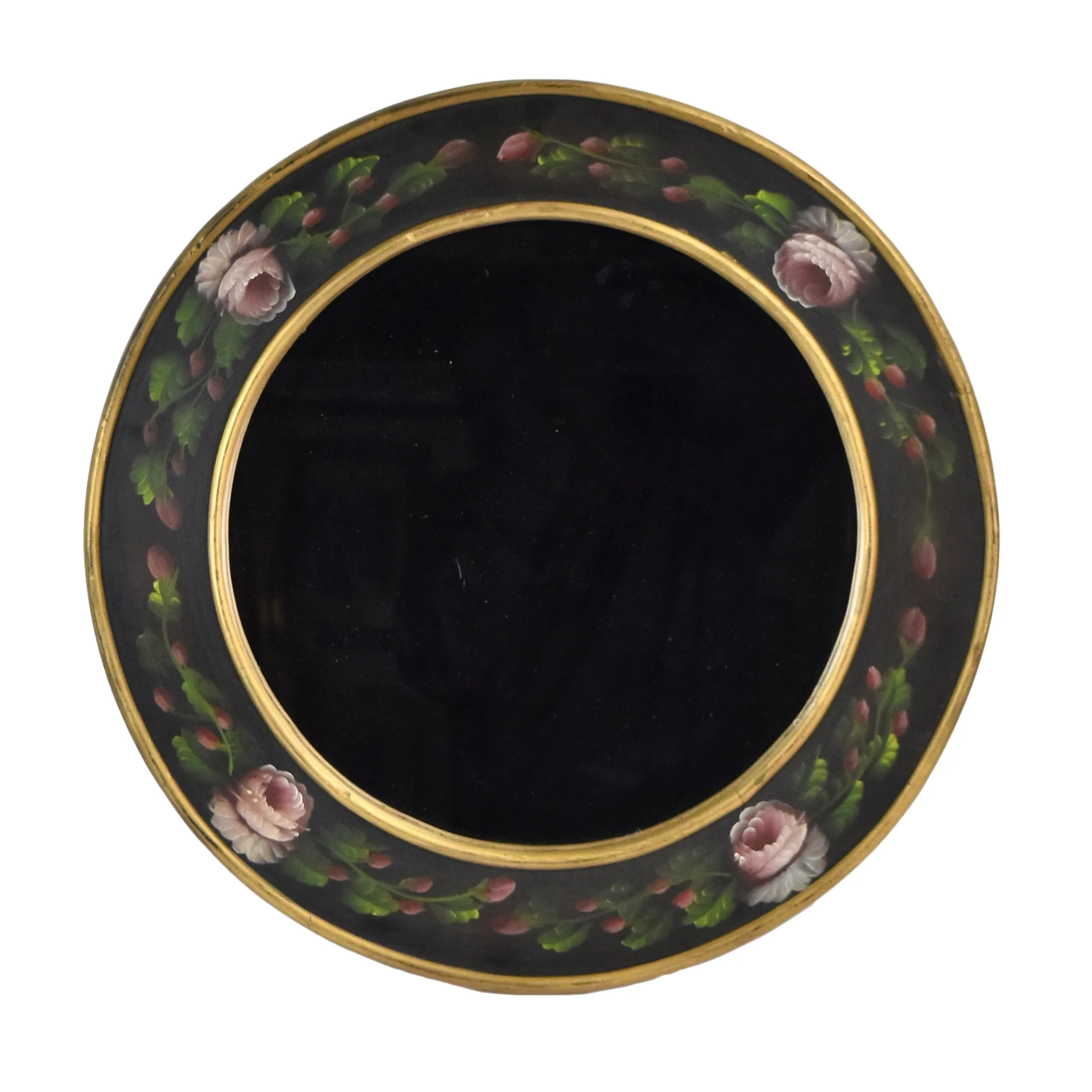Fabulous petite wall mirror, circular with a wider frame, all with hand painted flowers circling around the entire piece. Has a nice antique muted tone, giving it a warm and darker tone. Measures overall 22.5in diameter, 15.5in diameter mirror section only. Excellent vintage condition.