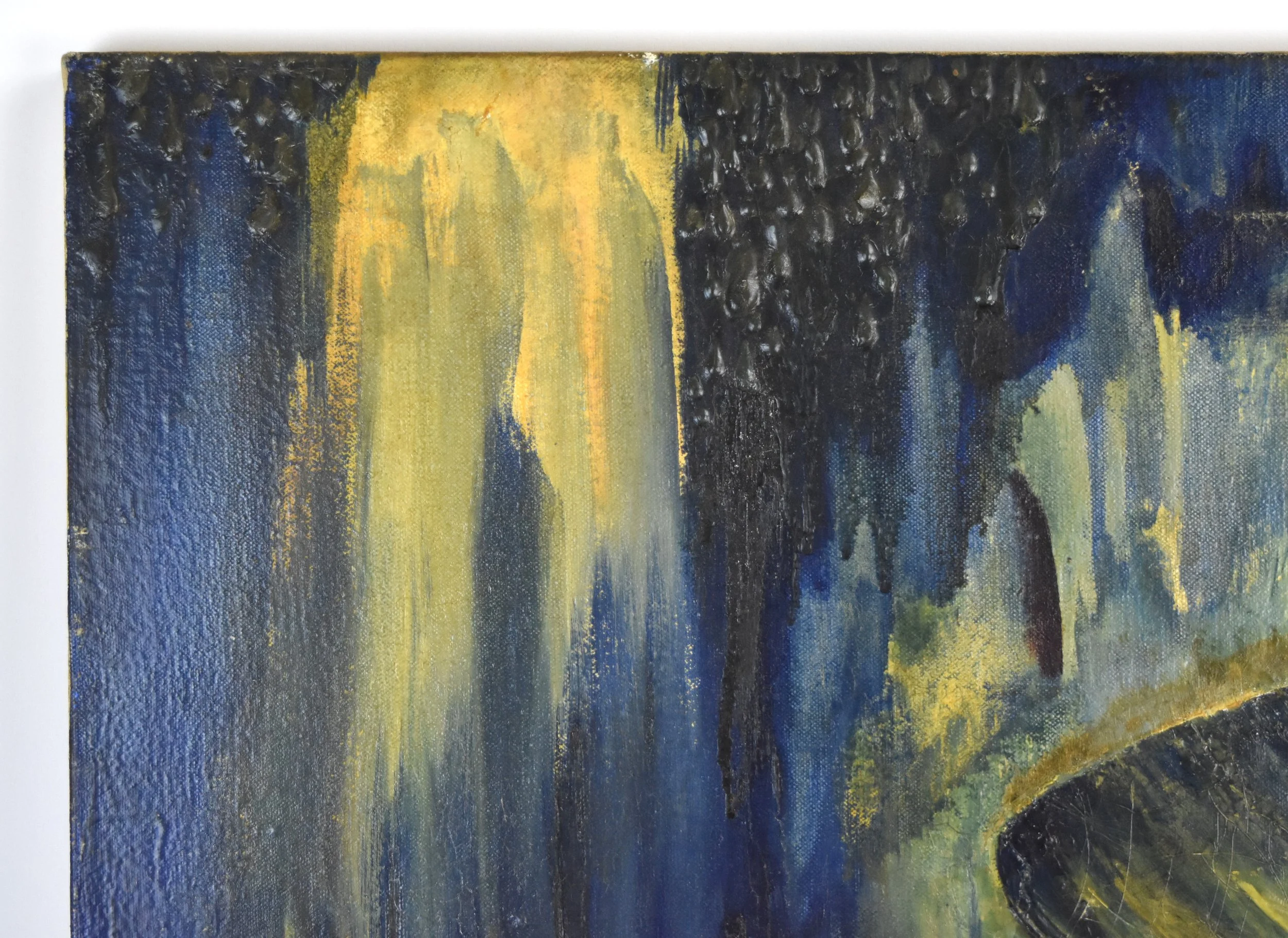 Haunting and surrealist oil painting portrait of a young beautiful woman in profile, surrounded by dark toned cloud like shapes. Oil painting on canvas. Signed lower right illegibly, Bruce ----, includes a poem or passage and signed again en verso. Measures overall 28in x 26in. Condition, good vintage condition, heavy craquelure in certain areas, top coat seems to be applied unevenly by the artist to create a unique texture, there are spots where it is wearing thin and flaking a bit (as pictured) but overall shows well.